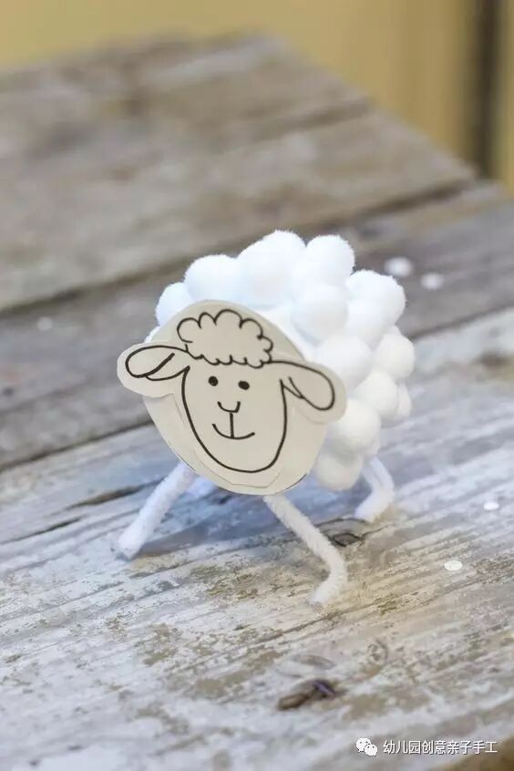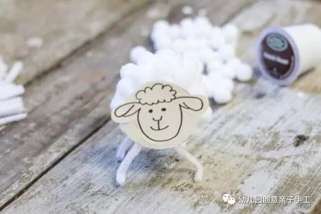 准备好一个绵羊头像卡片盖住塑料杯,在杯身粘满泡沫球或毛球,底部加上扭扭棒做好的羊脚。萌萌哒的小绵羊就做好啦!