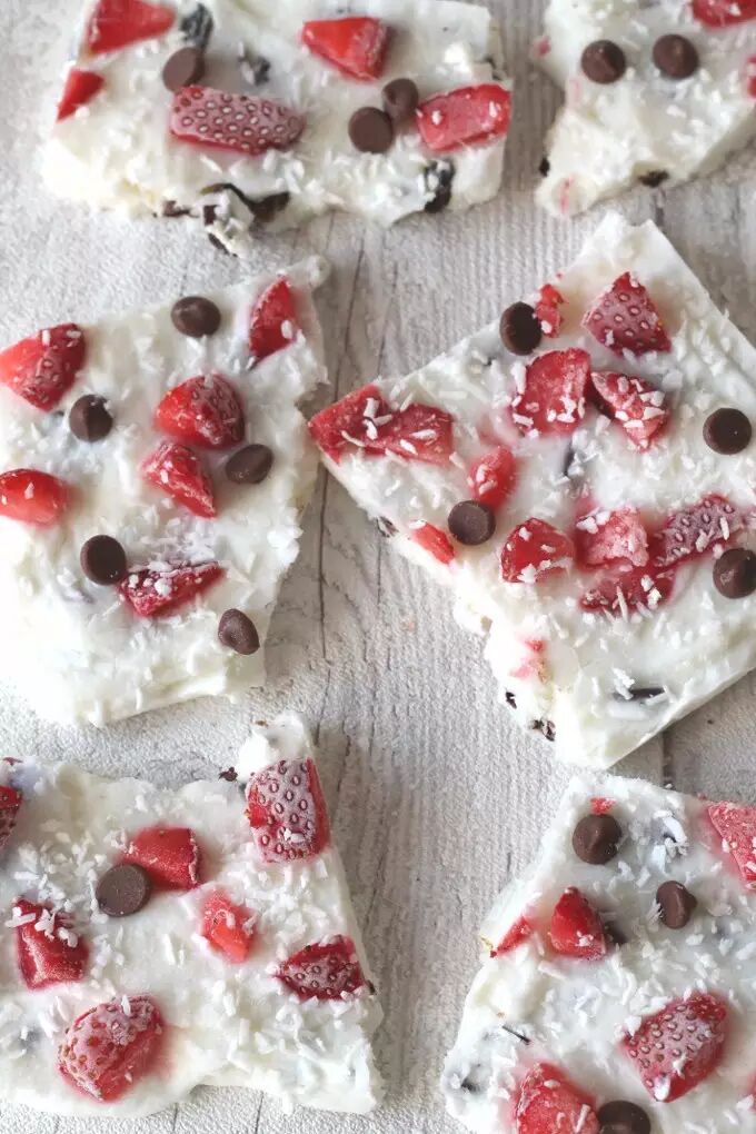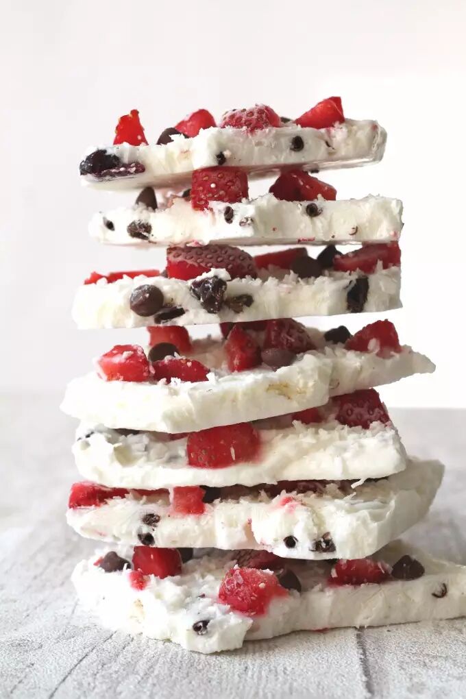 讲酸奶蜂蜜铺在锡箔纸的烤盘上,在上面撒上草莓、巧克屑、椰子粉,冷冻大约1小时;