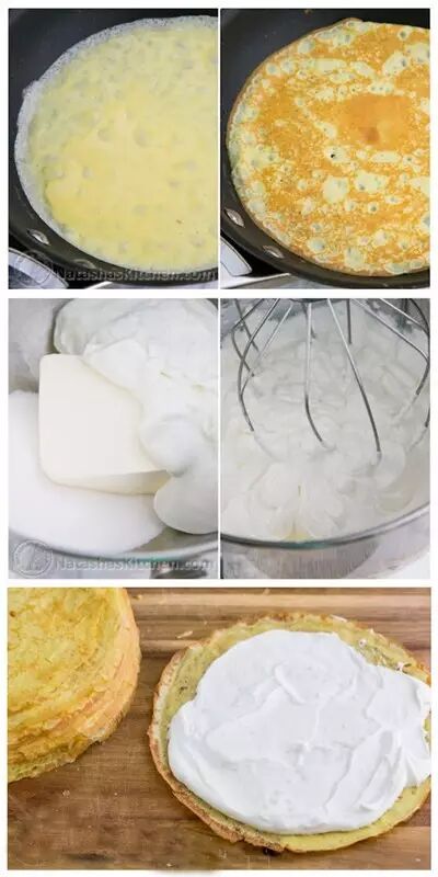 2.将酸奶和奶酪混合打发后抹在烤薄饼上;