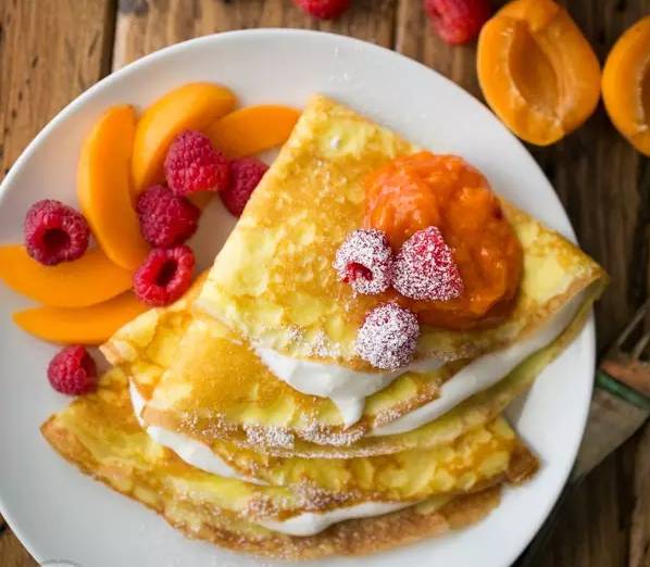 面粉250g、鸡蛋3个、牛奶500ml、室温黄油50g、酸奶、奶酪、新鲜水果or果酱
