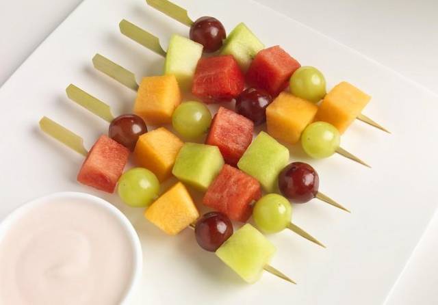 各种水果切粒串起来,