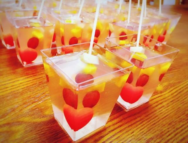 ② 把切好的果冻放入杯中,放至整杯的三分之二。