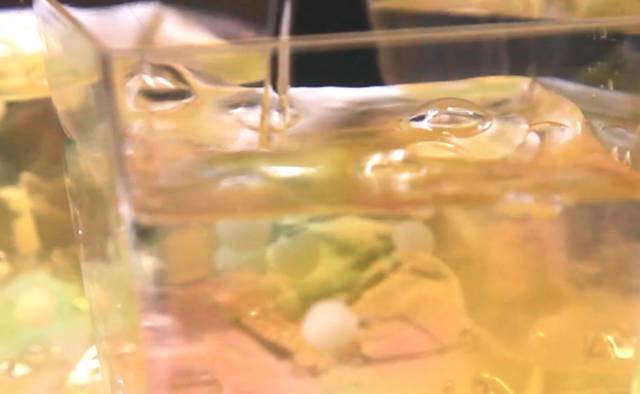 ③ 准备200ml无色透明的饮料,可以选用雪碧、七夕或者脉动,加入15g吉利丁粉,搅拌至吉利丁融化后倒入杯中,刚好没过果冻的位置。放入冰箱冷藏30分钟。