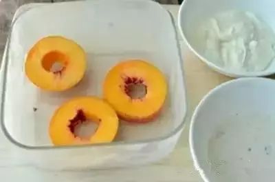 2.在桃片上抹匀酸奶,撒上各种装饰(比如糖果或坚果粒)