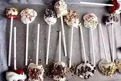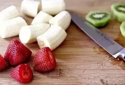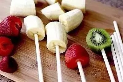 2.水果切断,草莓保持完整就可以了,确保棒棒糖棍能穿进水果里面