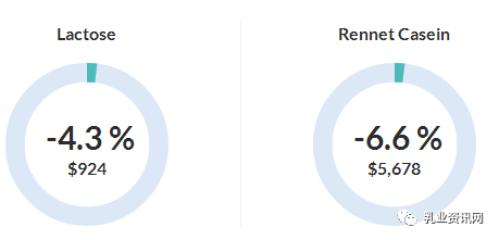 新西兰恒天然集团全球乳制品贸易平台第183次拍卖结果显示,全脂奶粉则由于投放量较去年大幅度增加,本次价格下跌12.4%,最新价格为2782美元;脱脂奶粉在翻番增量、总体的外盘也持续下跌的情况下,本次大跌15.5%,平均价2118美元;酪蛋白继续大幅度下挫6.6%,跌至5678美元,买卖价值显现。表现最好的仍然是BMP,大涨8.4%,达到1846美元/公吨;黄油小幅上涨1.2%,继续创新高4653美元;无水黄油在供应量比预期增加的情况下,小跌0.8%,均价为5653美元,持续高位盘整;乳糖下跌4.3%至924美元水平;切达奶酪继续下跌4.2%,至3435美元。