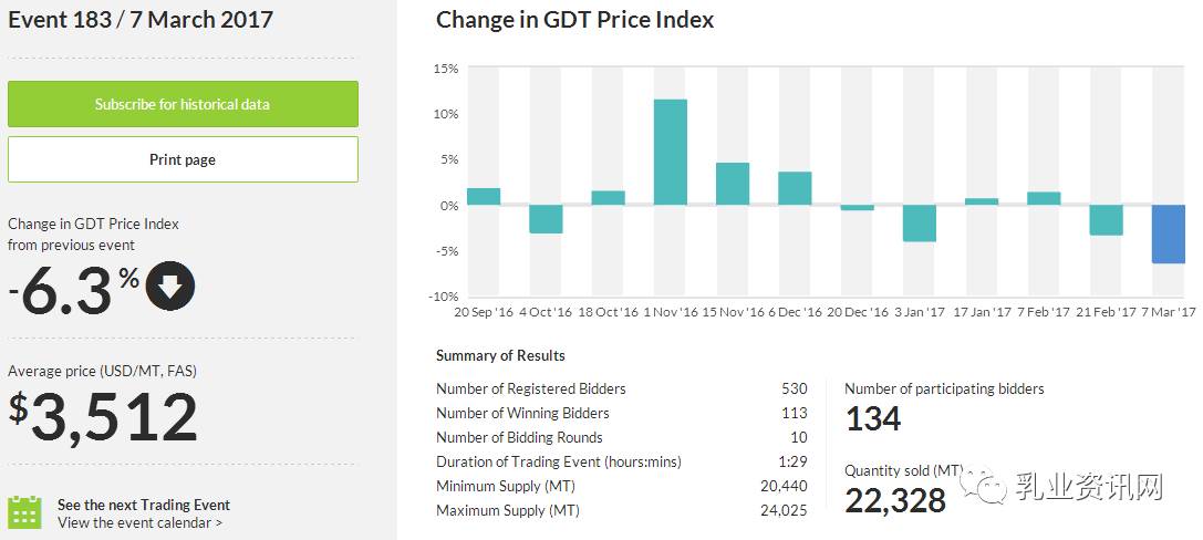本次拍卖在乳粉产品的萎靡不振影响下,价格水平整体大跌6.3%,平均价格回落至3512美元/吨(FAS);成交量上涨9%,共成交22328吨;本次参与拍卖客户参与数继续减少,为134户,比上次拍卖减少10%。