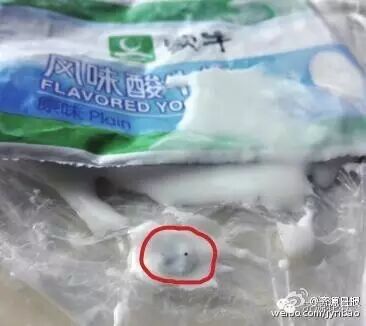 王先生于近日在宣化大街某超市内花了20元左右购买了一箱蒙牛牌袋装酸奶。10月15日,王先生8岁的儿子喝酸奶时说,酸奶里面有“果粒”。王先生很纳闷,因为酸奶的包装袋上并没有标明酸奶中有“果粒”。当儿子将“果粒”吐出来之后,王先生大吃一惊,这可不是什么“果粒”,而是一团黑黑的、黏黏的东西。