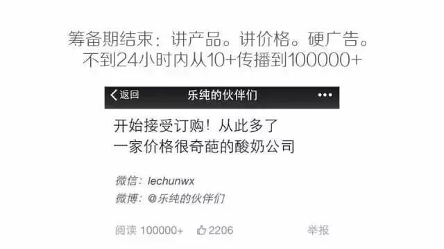 有个名叫乐纯的酸奶,在产品上线之前,写了一篇超硬的产品广告,几天传播下来阅读超过100万。文章讲了两件事:一乐纯卖的什么产品;二为什么这样定价。