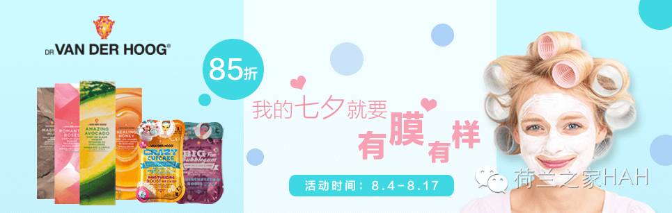 Dr.van der Hoog是荷兰的高级药妆品牌,以使用自然原料而闻名,生产高品质安全可靠的产品,又非常注重时尚,至今已经有100年的历史。Dr. van der Hoog有面膜系列(从火岩矿物泥,到各种水果,黑珍珠,玫瑰,有趣泡泡面膜等),肌肤清洁系列 还有最新的抗皱逆龄活肤系列产品。七夕将至,荷兰之家Dr.van der hoog全线产品85折!护理您美丽的容颜,从使用Dr.van der hoog开始 。