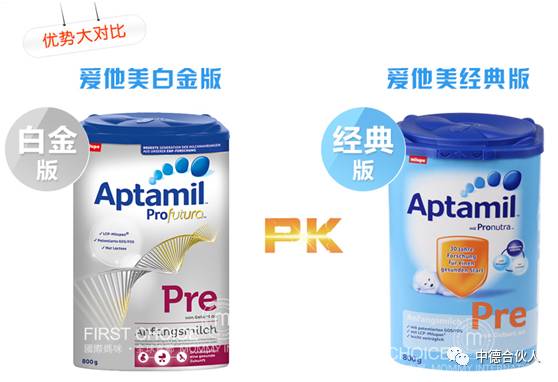 2014年10月,德国市场上又推出了一种白金版爱他美(上图),在原来蓝罐经典版爱他美基础上升级后,包装高上大了许多,配方也做了调整,当然白金版爱他美比经典版蓝罐爱他美价格也上涨了30%,成了德国本地市场上最贵的婴儿。