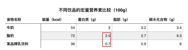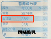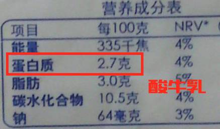 而营养标签上也能体现出酸奶和饮料之间,最大差异的就是蛋白质了。风味酸乳的蛋白质含量不能低于2.3g/100g,而乳饮料的蛋白质含量一般只有1g/100g左右。