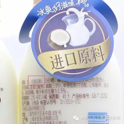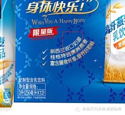 但也还是有相当一部分产品,配料里面明明有奶粉或者是奶油,但在外包装上却没有标注任何“复原乳”的字样。这个时候我们就要特别注意去看产品配料表了: