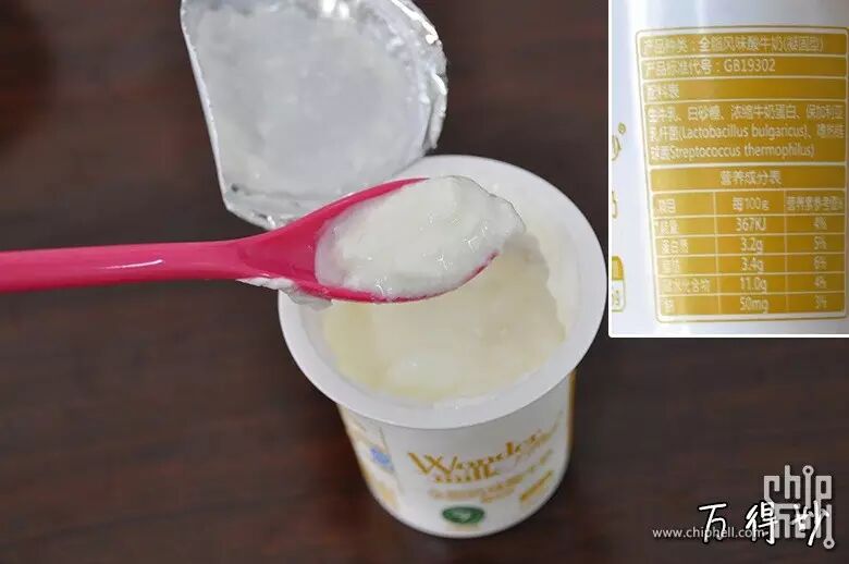 万得妙:白色,比光明如实稀,也因摇晃的原因,凝固状态欠佳,口感吃起来没有很大特点,比较甜,一看标签,果然白砂糖排配料表第二位,糖分(碳水化合物)含量竟然是光明的两倍,后味比较重,不太好吃。