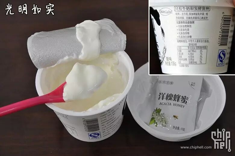 光明如实:包装上写着“只有牛奶和发酵菌种”,看配料表确实没有其他添加剂。可能因颠簸的原因,开盖后,里面的凝乳有些散了,没有“北京记忆”的状态好。颜色乳白色,有点奶油状,有光泽。入口比较酸,没有明显甜味,略有些涩口,糊口感很强,感觉都可以当奶油抹面包了。酸奶味道比较纯正,厂家很贴心,应该是考虑到了纯酸奶的酸涩,还配有洋槐蜂蜜,加入蜂蜜后,口感味道立即提升。个人比较喜欢这款,但是同事都觉得太酸了。