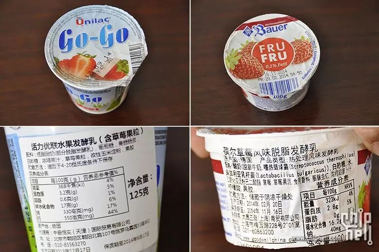 活力优联&葆尔草莓脱脂发酵乳:这两个都是德国进口的,而且保质期超长有9个月,是经过热处理的,可想里面不可能还有活菌,吃起来感觉比较“面”,不清爽,而且果酱味很浓,如果偶尔吃吃,问题不大,如果经常吃就不好了。这两个碳水化合物的含量最高,16-17g/100g,一小盒有1/6多都是糖,还有色素、果胶什么的,太吓人了。