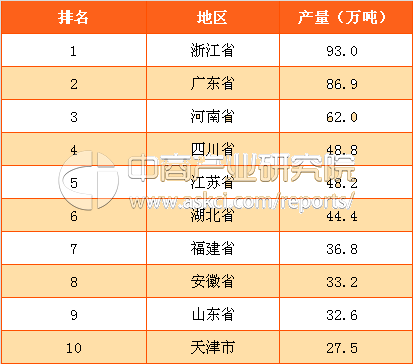 2017年3月,乳制品产量排名前十的地区分别是浙江省、广东省、河南省、四川省、江苏省、湖北省、福建省、安徽省、山东省、天津市,产量分别达93.0 、86.9 、62.0 、48.8 、48.2 、44.4 、36.8 、33.2 、32.6 、27.5 万吨,浙江省产量93万吨,居第一位。
