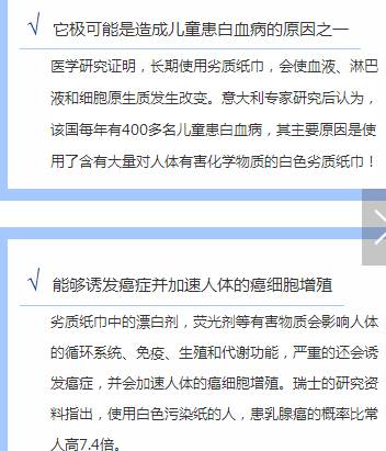 近期,一则网帖引起网友热议,帖子里引用了央视一段对纸巾品牌的调查,还列举了劣质纸巾中含有的荧光剂等物质对孩子的六大危害,如造成儿童患白血病等。