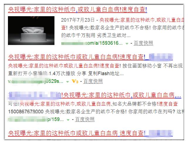 首先,帖子里所说的央视调查节目,内容是北京市消协对各品牌纸巾进行的抽查检测。节目只提到了抽检纸巾的卫生质量不达标问题,没有提到帖子里所说的“儿童白血病”等内容。