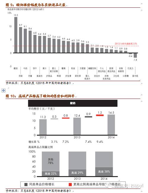 随着中国人口消费升级,同类酸奶价格(以及利润率)不仅持续增长,层出不穷的高端品类更是推涨了酸奶整体均价。从2012-2014年,酸奶单价年均增长13.5%,其中7%-9%来自于高端产品的推出和普及。