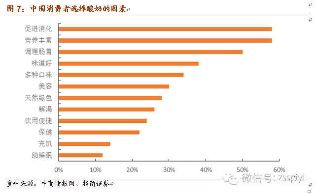 改善肠胃功能。2015年中国12城市肠胃年龄洞察报告显示,57%的33-55岁的中国城市居民有肠胃超龄的问题。城市居民生活饮食习惯缺乏规律的同时,又由于工作等原因存在较大的精神压力,多数人存在经常性的肠胃不适问题。酸奶的活性乳酸菌能帮助肠胃改善功能。其他咨询机构的调查进一步佐证了以上观点。酸奶产品的口味、营养和健康调理三大益处被广大消费者接受并推崇,造就了酸奶市场如今的发展。