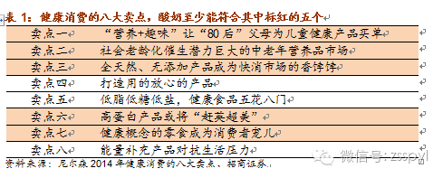 酸奶产品符合消费者健康趋势。尼尔森在2014年总结了健康消费的八大卖点。酸奶产品能轻松迎合其中五个卖点,甚至更多。