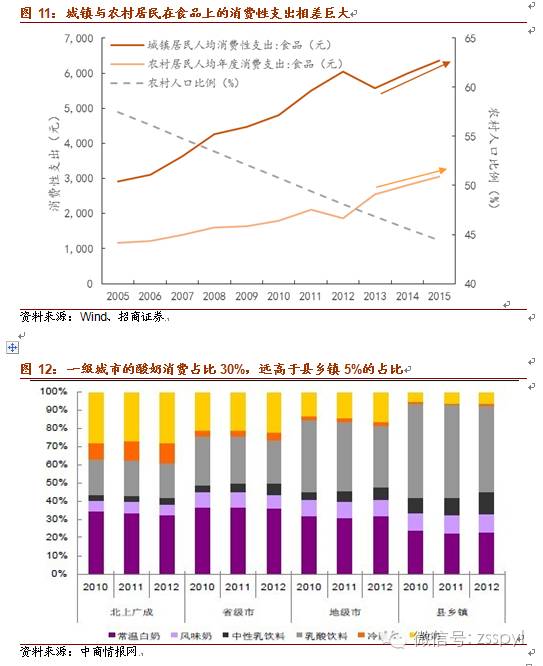 城镇居民的消费能力远超农村人口,近年的增长趋势也略快于农村人口。从数据上看,北上广等发达城市的酸奶消费占比远高于乡镇消费者。随着城市化进程的推进,越来越多的农村人口转化成为城镇居民,不断地为酸奶消费支出注入增长动力。