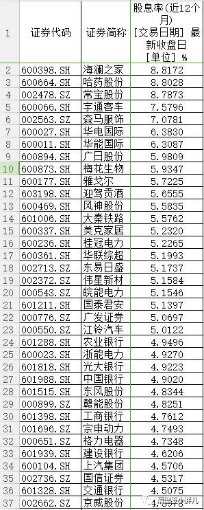 给大家分享一个截至目前股息率最高的前37位的个股,数据来源WIND。顺便普及下股息率,股息率是股息与股票价格之间的比率,就是分红除以股价,我筛选的是近12个月的个股股息率,有的是两次分红的,比如海澜之家,大家借鉴的时候一定要看清楚。
