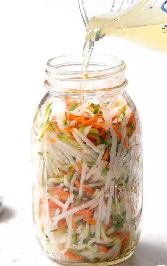 3、把白萝卜、胡萝卜、黄瓜放进玻璃罐,倒入调味汁,搅拌均匀