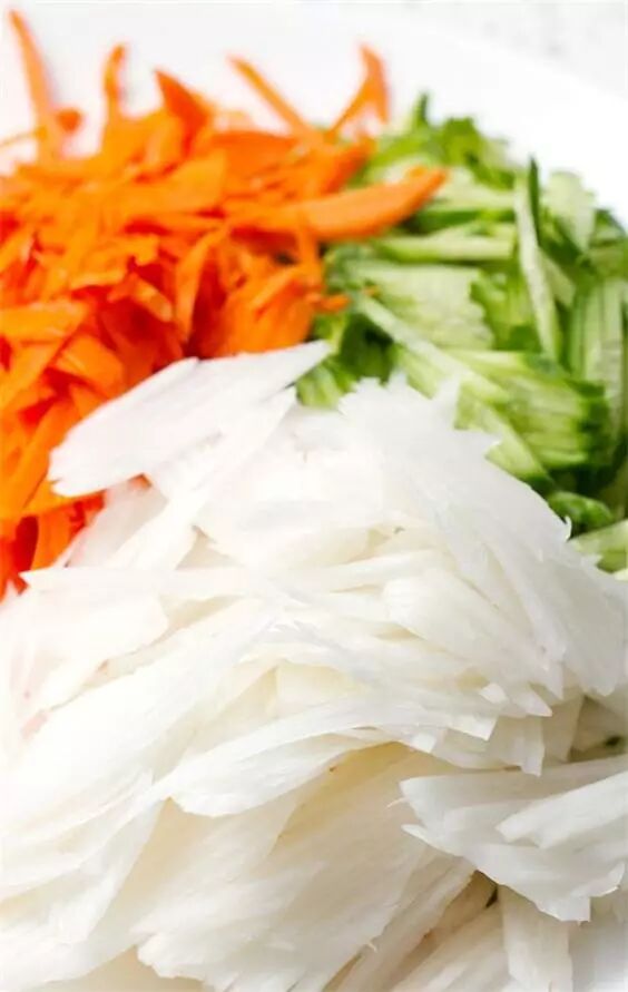1、白萝卜、胡萝卜、黄瓜洗净切丝,放在同一个盘里。