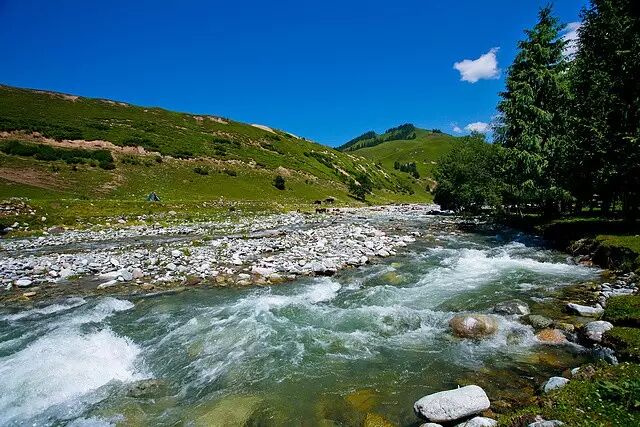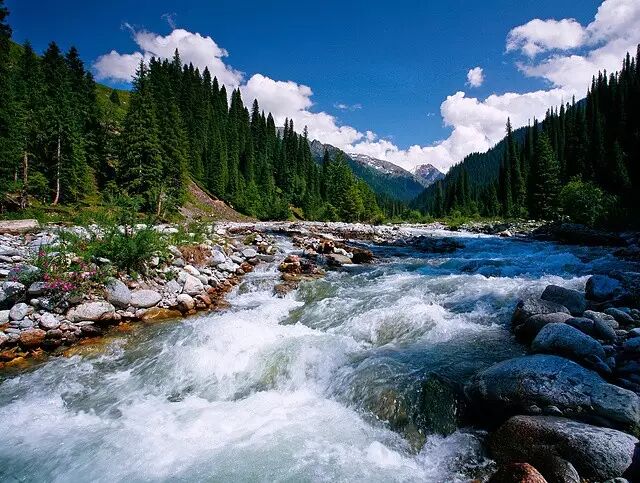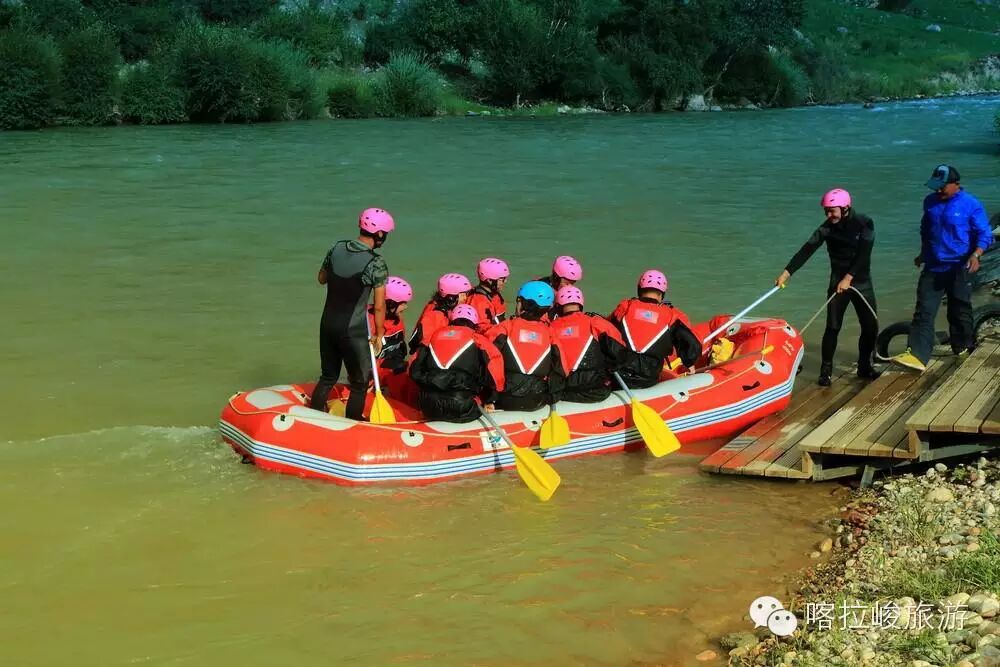 盘绕着奇峰异石,缓缓流入喀拉峻湖。林深水碧,这里的绿色纯粹得让人忘记夏日的炎热。漂流更是让人流连忘返。